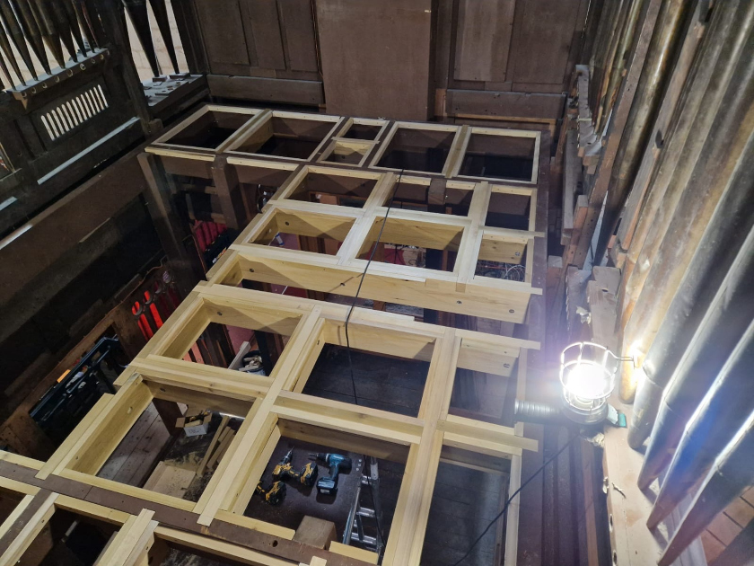 Finally, a taster of what is to come at Gloucester Cathedral: this image shows the first new work inside the historic organ cases. It is the building-frame installed during September to take the Great and Solo divisions. In October the 16ft Open Wood and 32ft reed will be installed inside the north side of the Screen. The main installation will begin in January 2026.