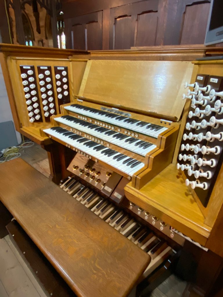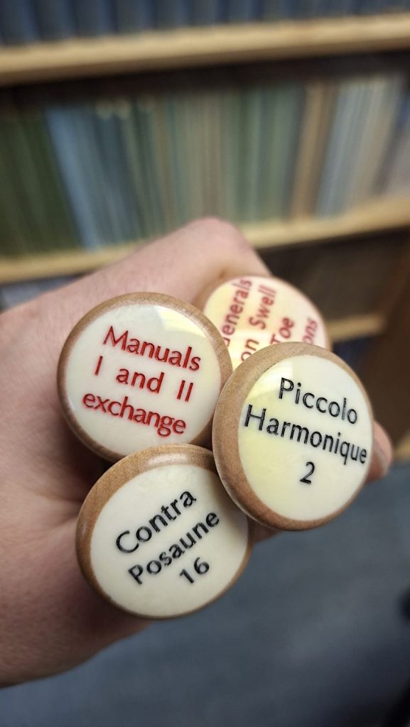 One of my projects (St Mary’s Moseley, Birmingham) was completed this month; I visited on November 18th to sign it off. Originally a Henry Jones organ from 1885, it was rebuilt by Nicholsons in 1966 and now has been again by Clevedon. The Nicholson console has been rebuilt and a great deal of work was carried out to the organ, both to reclaim something of its Henry Jones tonality and also to project its tone better down the nave, which totally lacks resonance. The Henry Jones console remains, as a museum-piece, and a handful of stolen stop-knobs (of ?unique oval shape) have been replaced by matching new ones, crafted by Renatus of Bideford.