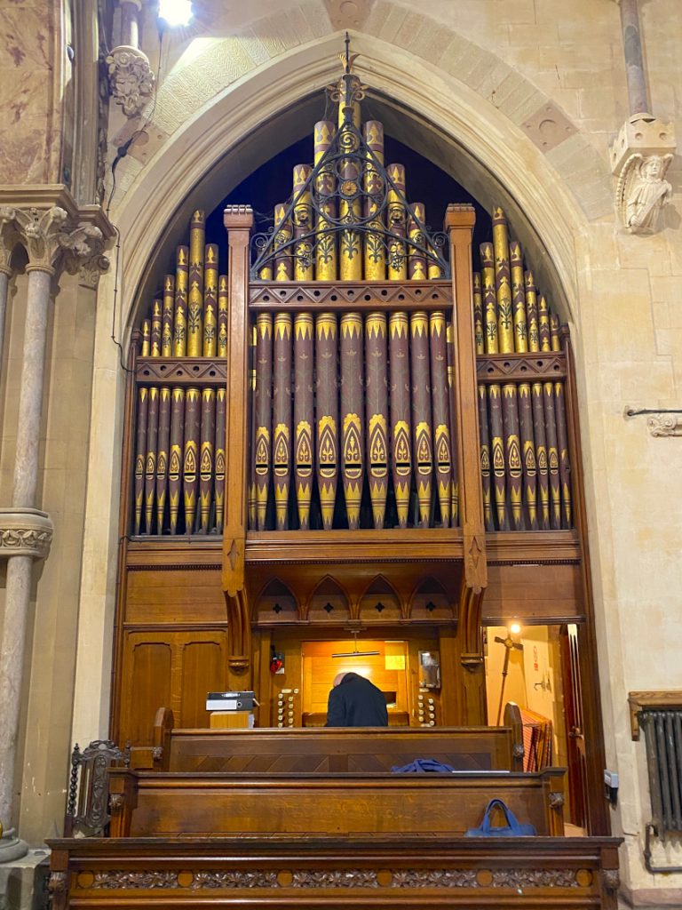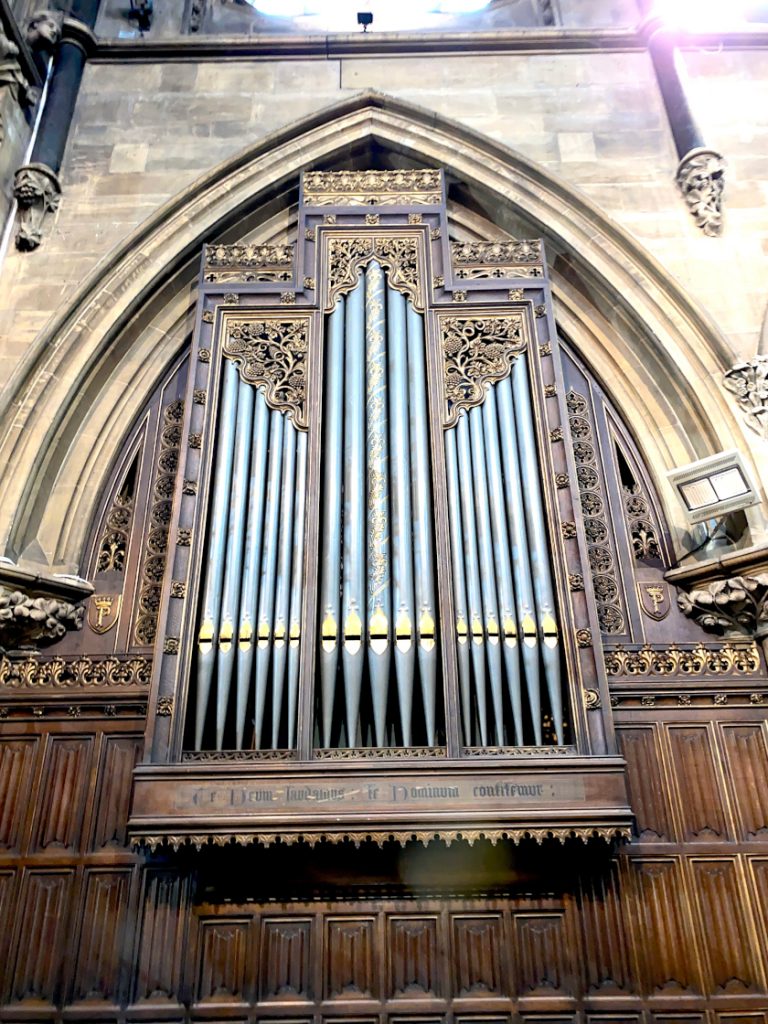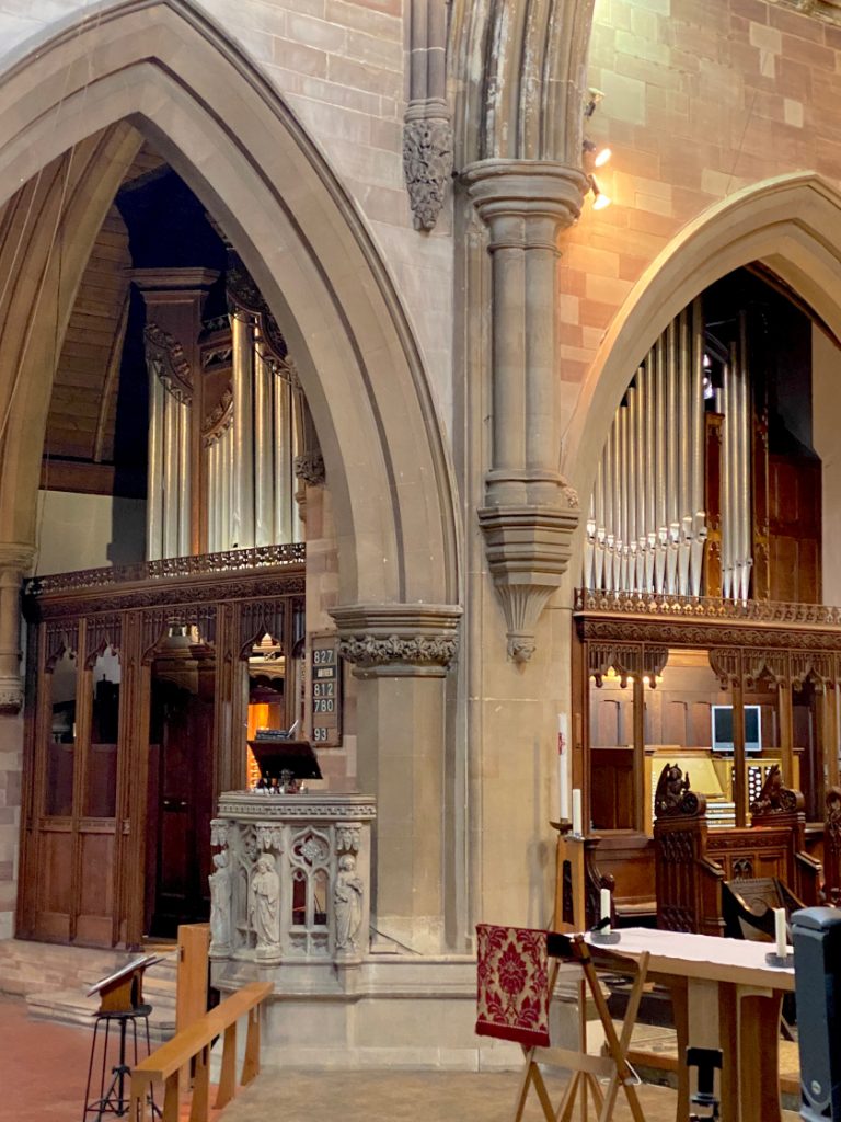 Next (to see the beautiful organ cases only) was St Paul’s church, where once there was a 4-manual Hope-Jones rebuild of a Hill. Of the two contrasting G.F. Bodley cases, the chancel case now contains a transplanted Conacher, whereas in the huge south transept case sits – silent – the Hope-Jones Solo Organ. All rather reminiscent of the Worcester Cathedral organ situation, where the 32ft case in the south transept still awaits the promised second organ.